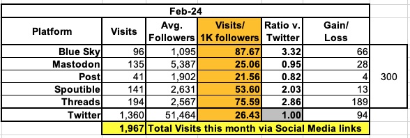 One other noteworthy item: Not only have I stopped losing followers on Twitter after last fall's post-October 7th antisemite diaspora, but I actually gained followers for the second month in a row (+42 in January, +94 in February). Across all 6 platforms I gained 300 new followers total.
