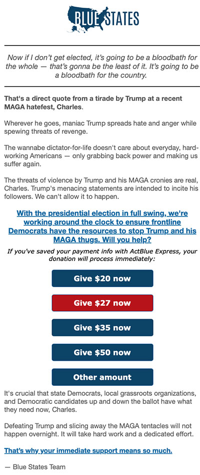 With that in mind, I decided to pick one of the fundraising emails I received at random (there were like a dozen which had come in that day alone...no matter how many mailing lists I opt out of I seem to be added to two more...).