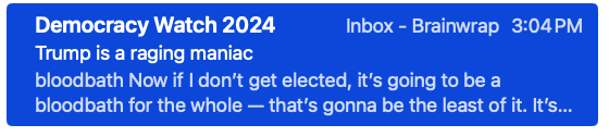 The "from" says "Democracy Watch 2024" but the return email is "info@bluestatespac.com" and the body of the message looks like this: