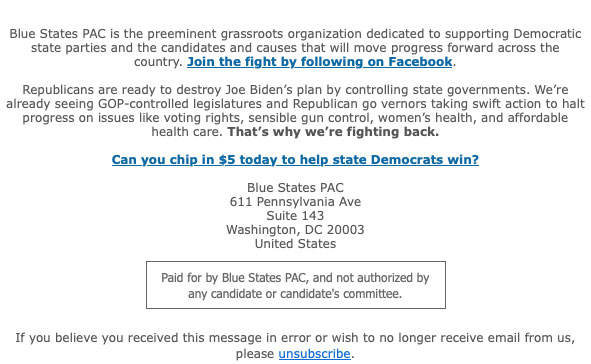 EveryAction, Inc. is now called Bonterra. Those are the guys who I presume have been churning out the mountain of spam emails...I've received a whopping 72 more from Blue States PAC since March 20th, an average of 4 per day.