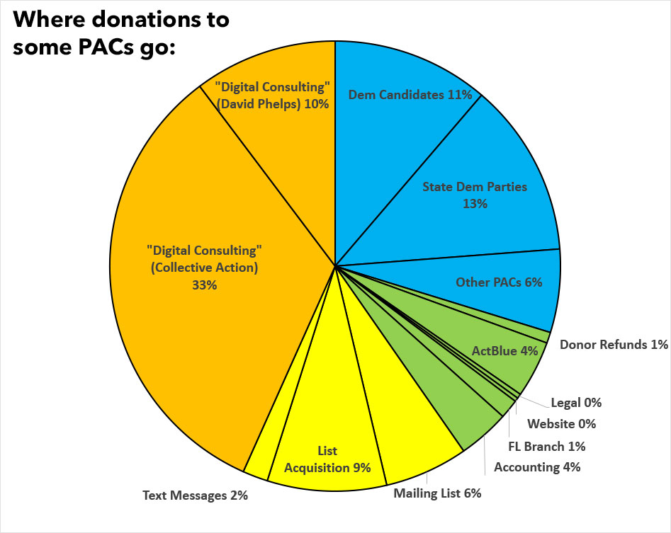I want to be clear: Many, perhaps even most of these PACs do great work, donate a high percentage of what they raise to the actual campaigns and/or utilize funds to create effective ads or other materials/projects to help elect Democrats and defeat Republicans.