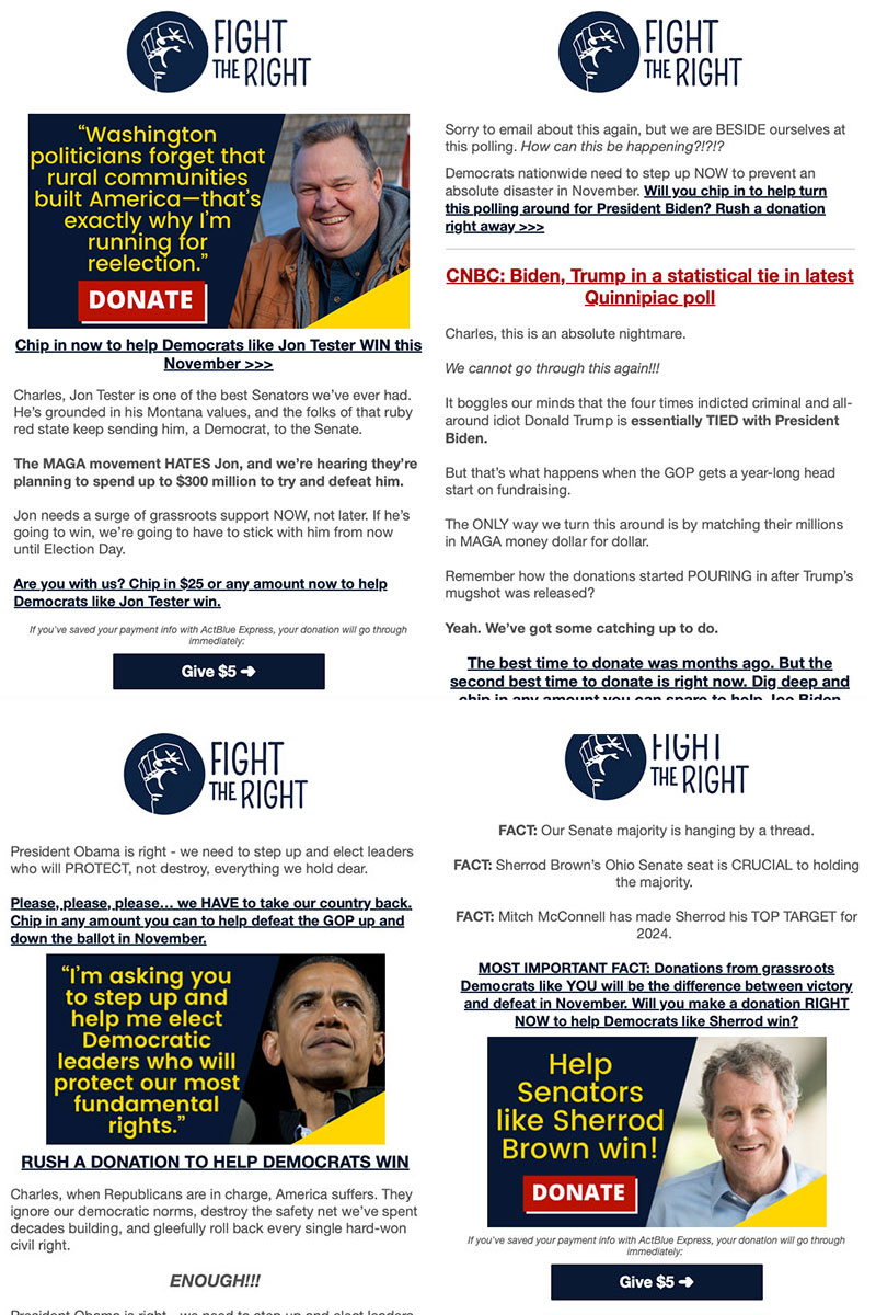 Anyway, like "Blue States PAC," the emails from "Fight the Right PAC" also love to slap the names & images of various Democratic candidates in there...but the wording is very careful to never actually state that any of your donation will go to those specific candidates: