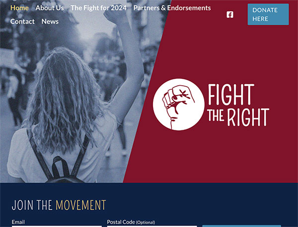 The only real difference is that "Fight the Right" includes a few extra pages like "About us" and "The Fight for 2024" (both of which are just generic "fight for democracy" boilerplate language), a "News" link which brings up a blank page, and a "Partners and Endorsements" page which seems like it might be interesting until you visit it and realize that no, they haven't been endorsed by anyone; it's just images of four candidates and two action funds which they say they gave money to during the 2022 election cycle.