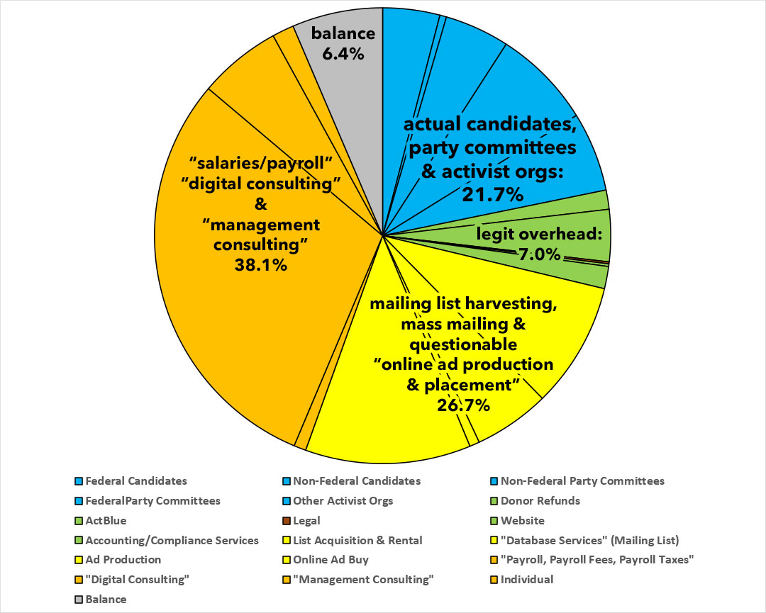 - A full 17% went towards "marketing" and "outreach"...that is, buying the email lists & phone numbers and then spamming the shit out of both of them with emails and text messages