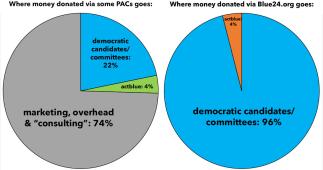 Again: 96% of what I raise via the links at Blue24.org goes directly to the specific candidates campaign funds (and/or Democratic Party committees/etc) clearly listed on each page. The other 4% goes to ActBlue for their gateway/processing expenses and other overhead, which is quite reasonable.