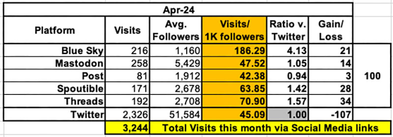 In April this changed significantly in most cases: Threads and Spoutible were only 1.4 - 1.6x higher than Twitter, while Mastodon and Post both ran about even with it. The big exception was Blue Sky, which still received more than 4x the engagement per follower than Twitter did. Not sure what to make of that.