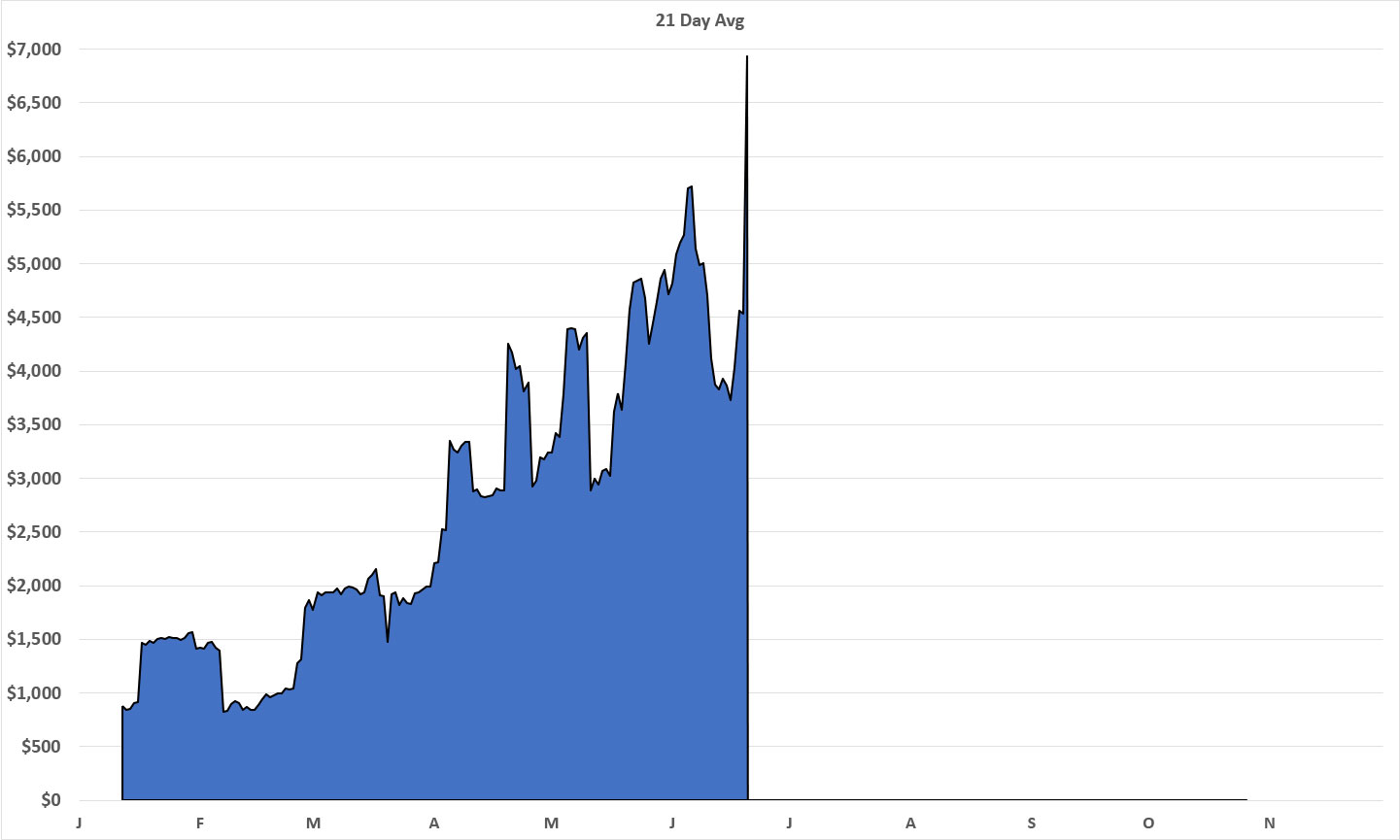 Here's what the rolling 21-day average looks like for overall fundraising. As you can see, the infamous June 27th "debate" and the absurdly over-the-top response from media & political pundits led to a MASSIVE spike in donations over the final few days of June (admittedly part of this was also likely due to June 30th being the final day of the month and the final day of the 2nd quarter, which is a Big Deal from a quarterly campaign finance report POV: