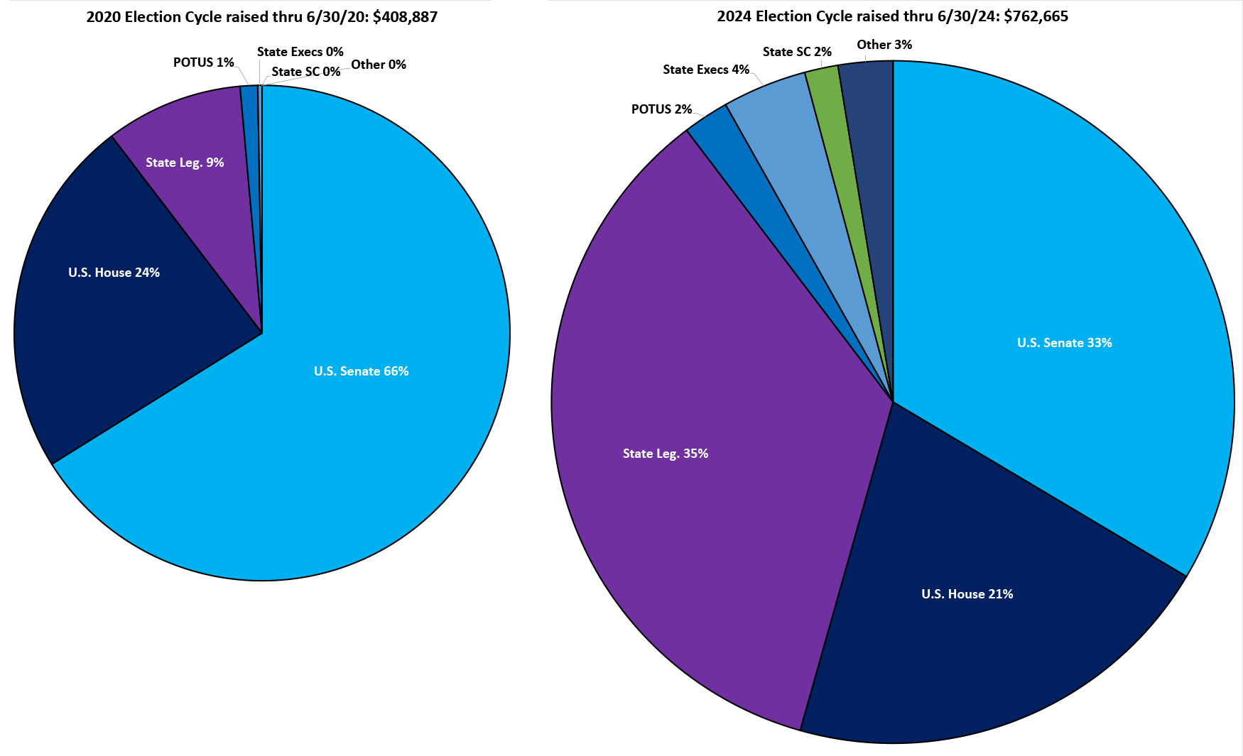 The most dramatic difference is the MASSIVE in state legislative race donations--up 7.3x as much so far vs the same point last cycle!