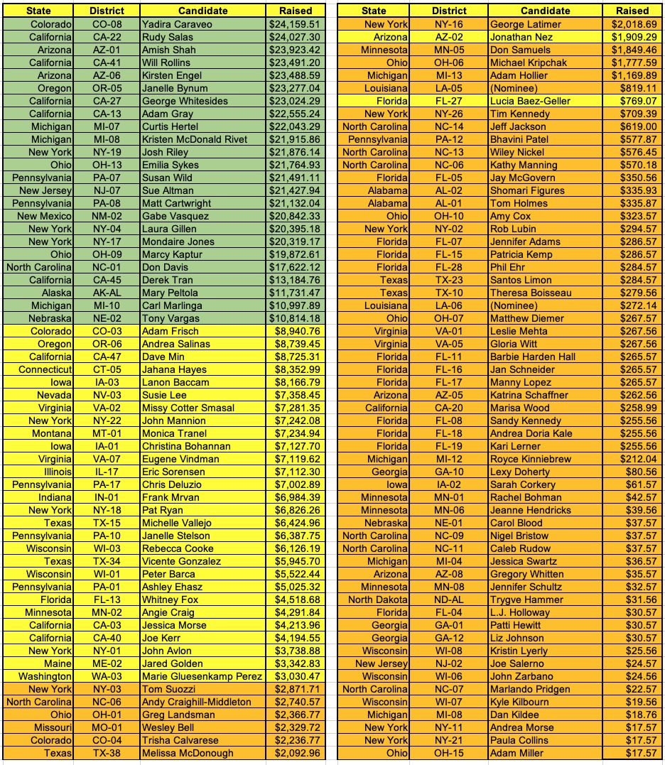 Here's the breakout of my U.S. House fundraising thru the 15th. I recently added an "Unlikely Heroes" page which includes 160 districts considered non-competitive by the major election pundits/analysts, but I figured I should at least give people an easy way to donate to them if they really want to: