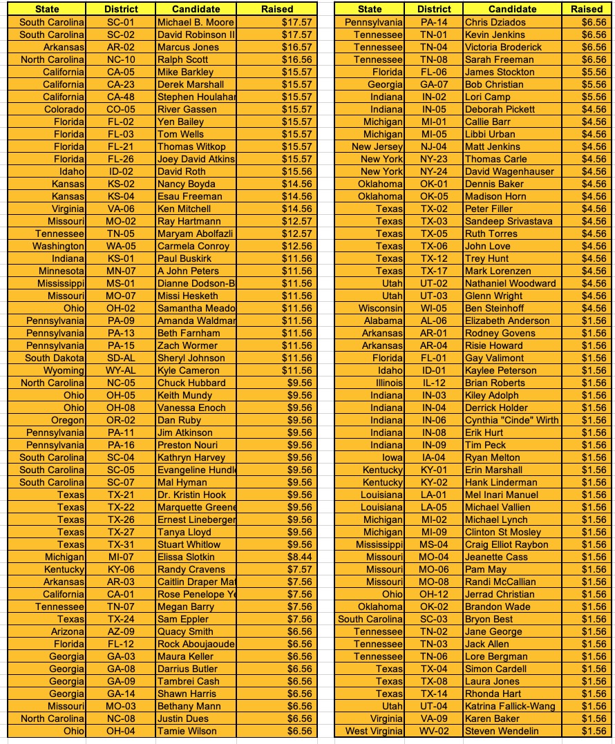 I'm raising money for a total of around ~650 state legislative candidates, so that breaks out to an average of around $950 apiece so far.