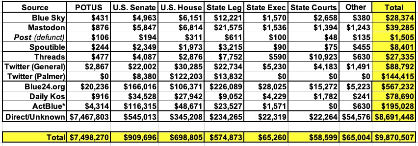 While the chart above may make it seem as though the social media posts aren't that effective, it's important to remember that a) again, I sometimes forget to include referral codes myself when posting to social media, and b) many people who show up as donating via the links here at Blue24.org found that link via my posts on Twitter, Blue Sky, Threads etc.