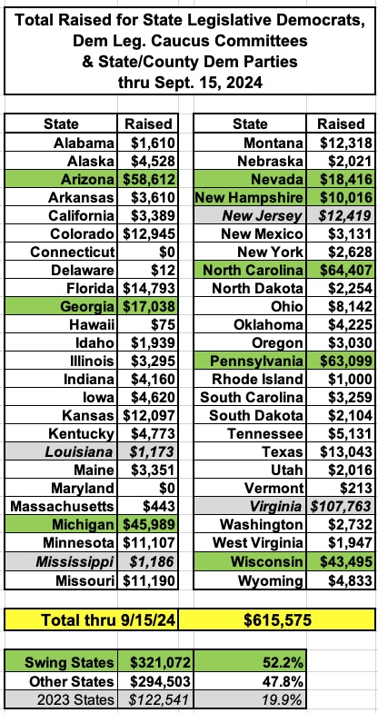 Here's the breakout of what I've raised for State Legislative Democrats, including the State Democratic Parties & Democratic legislative caucus PACs whose sole purpose is to elect state legislative Democrats.
