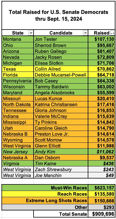 Here's how much I've raised to date for each U.S. Senate candidate. As you can see, the Tier 1 races are well ahead of the Tier 2 ones, with the exceptions of the two which I removed some time ago (Kim & Kaine).