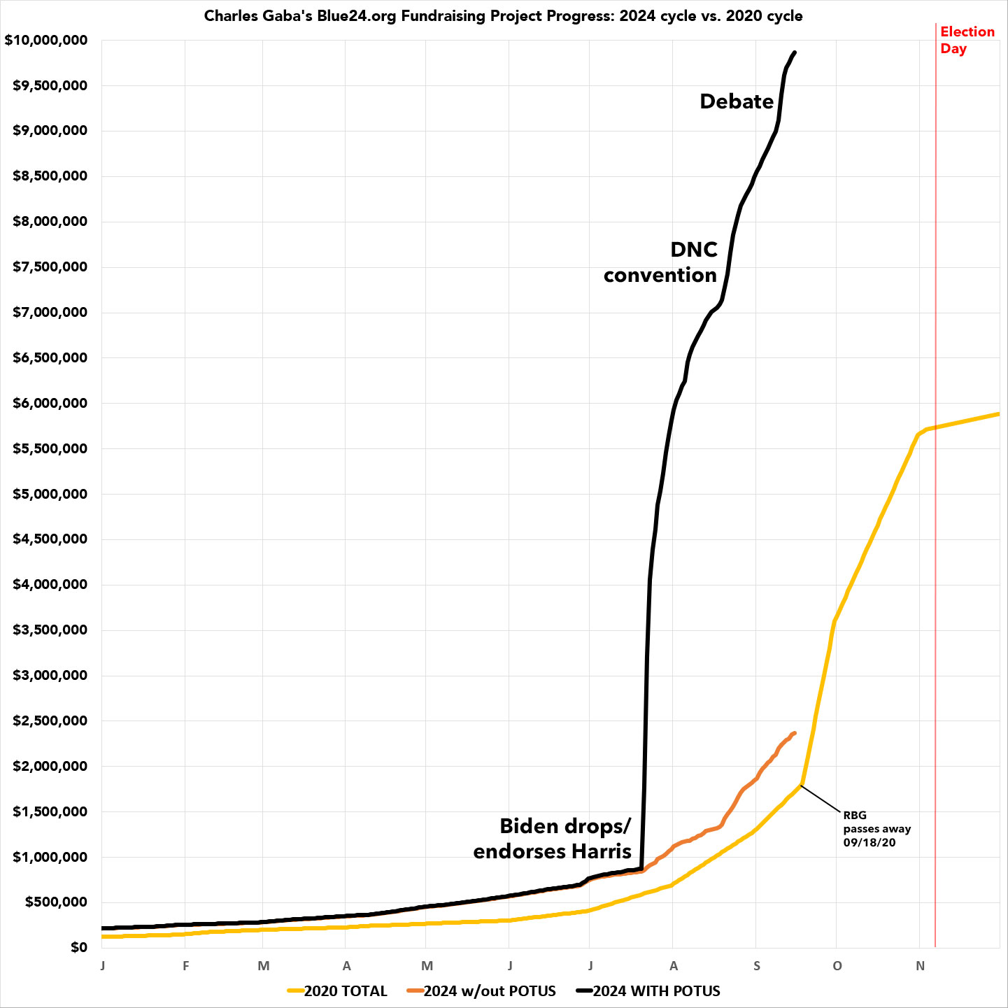 (I've also included a green line showing what my 2024 fundraising looks like without POTUS included...as you can see, it's still well ahead of the same point 4 years ago.)