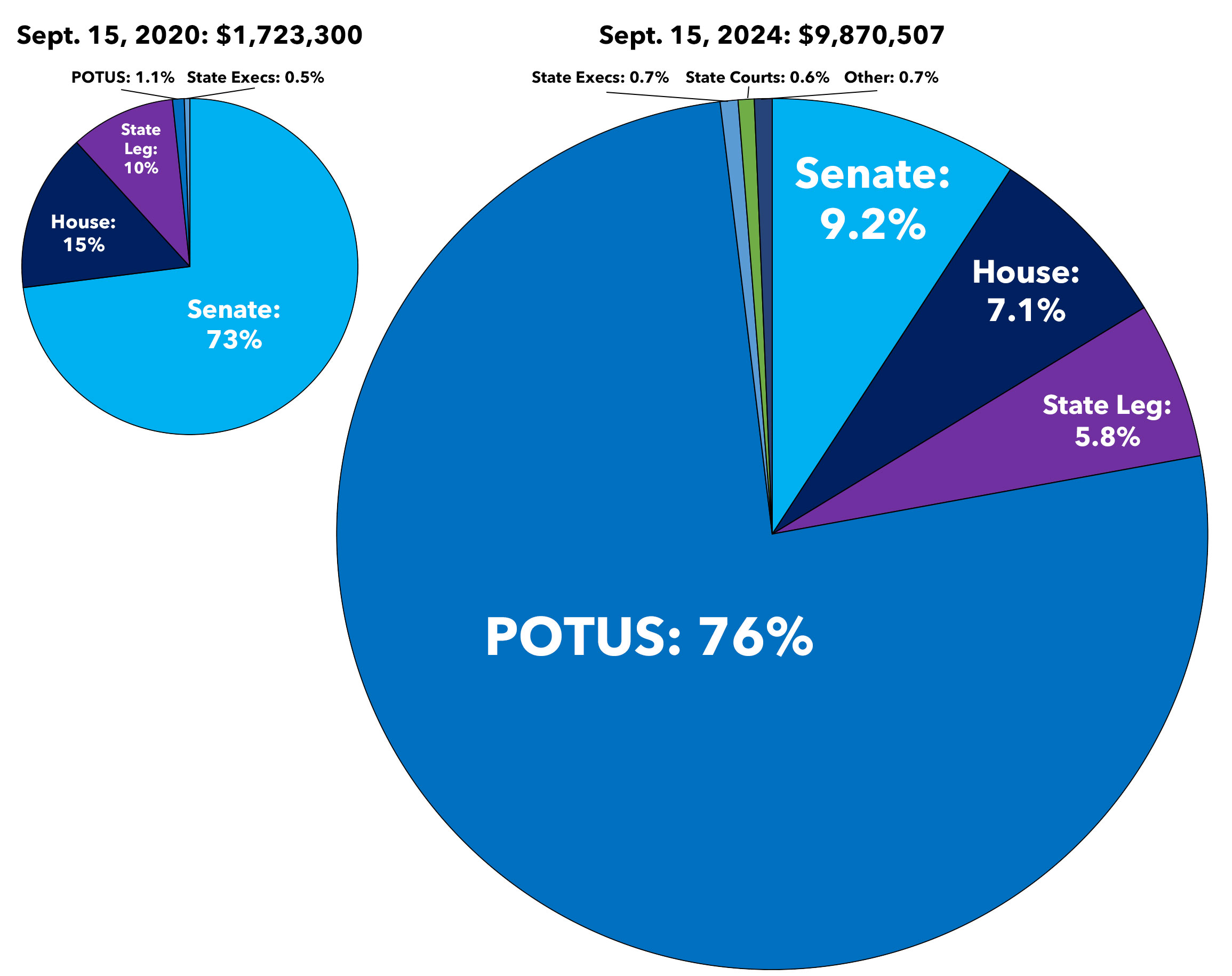 Here's what they look like side by side...scaled to reflect the massive increase in the overall size of the fundraising pie vs. four years ago: