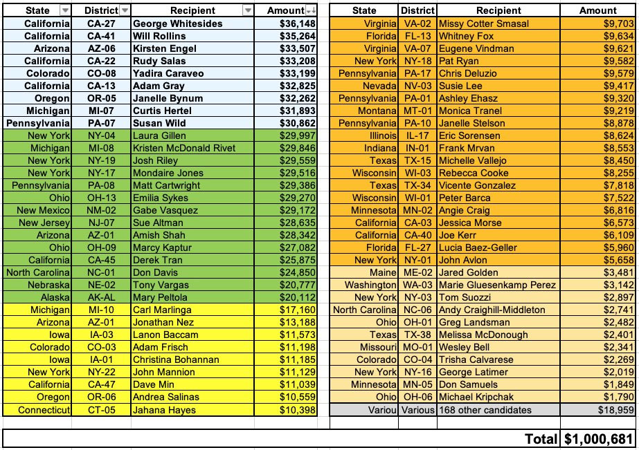 Here's the breakout of my U.S. House fundraising thru Oct. 13th for the top 64 seats (plus another ~$19,000 for an additional 168 races combined). This is missing another ~$25,000 from Oct. 14th. I've color coded them by those for whom I've raised more than $30K, those $20K - $30K, those $10K - $20K, those $5K - $10K and those from $1K - $5K raised: