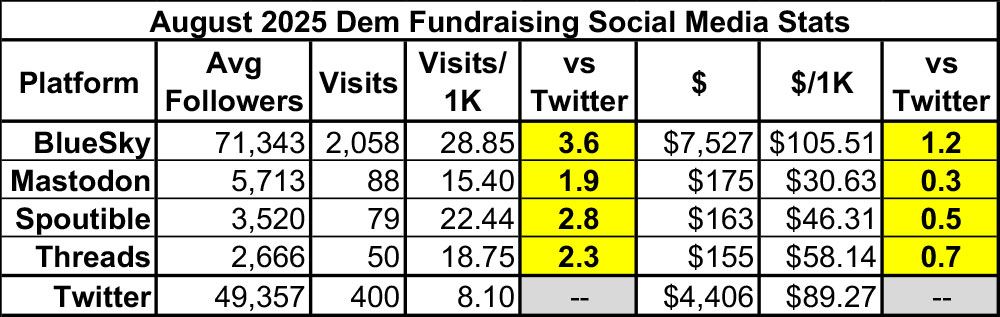As for social media engagement, August was something of an anomaly: While Bluesky once again kicked Twitter's ass in engagement (3.6x as many link clicks per follower), it was only slightly ahead in terms of actual donations (1.2x as much as Twitter per follower):