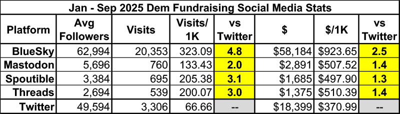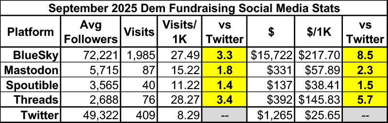 As for social media engagement, Twitter continued to get its ass kicked in September both in click-thrus per follower (Bluesky racked up 3.3x as many, and even Threads somehow won the month) as well as actual donations per follower (Bluesky generated a whopping 8.5x as much as Twitter last month).